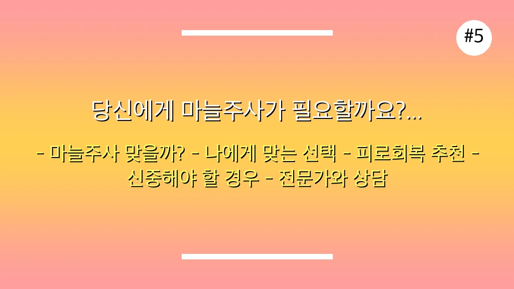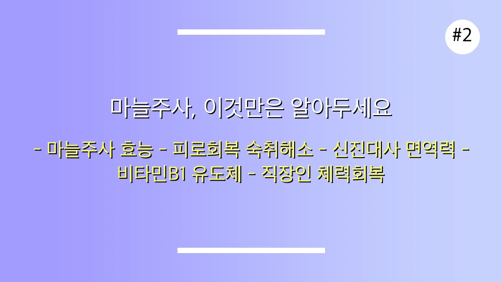- 만성 피로의 근본적인 원인 해결을 원하는 분: 마늘주사는 임시방편일 뿐, 생활 습관 개선이 더 중요합니다.