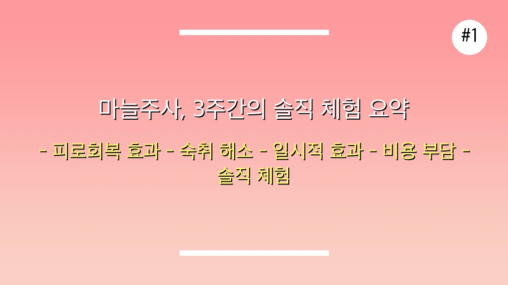 만성 피로에 시달리는 현대인들을 위한 '마늘주사'에 대한 3주간의 솔직한 경험을 바탕으로, 그 효과와 잠재적 부작용, 그리고 실제 가격까지 꼼꼼하게 분석하여 현명한 결정을 돕고자 합니다.