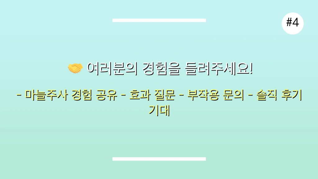 나만 이런 경험을 한 걸까요? 혹시 비슷한 상황에서 마늘주사를 맞아보신 분들이 있다면, 효과가 정말 좋으셨는지, 기대만큼은 아니셨는지, 혹은 혹시라도 부작용은 없으셨는지 궁금합니다. 여러분의 소중한 경험과 생각을 댓글로 공유해주세요. 서로 다른 관점을 나누는 것이 큰 도움이 될 것입니다.