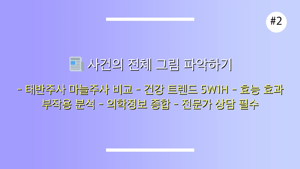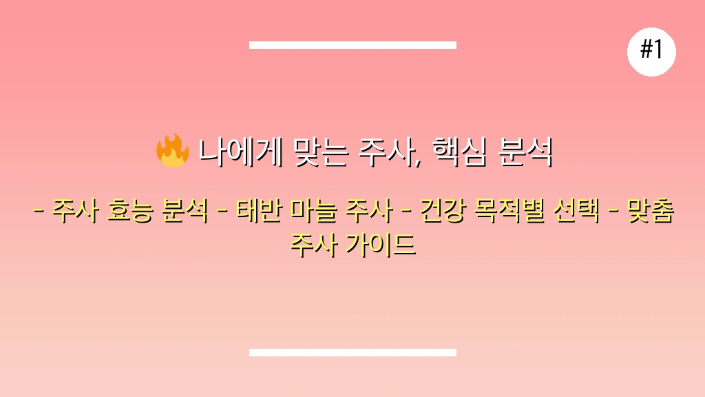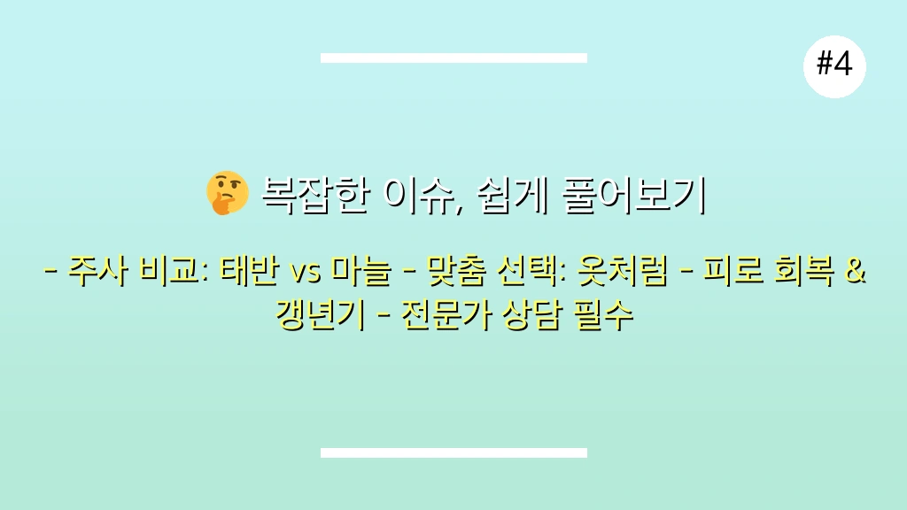 핵심 쟁점: 피로 회복, 피부 미용, 갱년기 증상 등 다양한 목적으로 사용되는 태반 주사와 마늘 주사의 정확한 효능과 효과, 그리고 개인별 적합성을 심층 분석합니다.