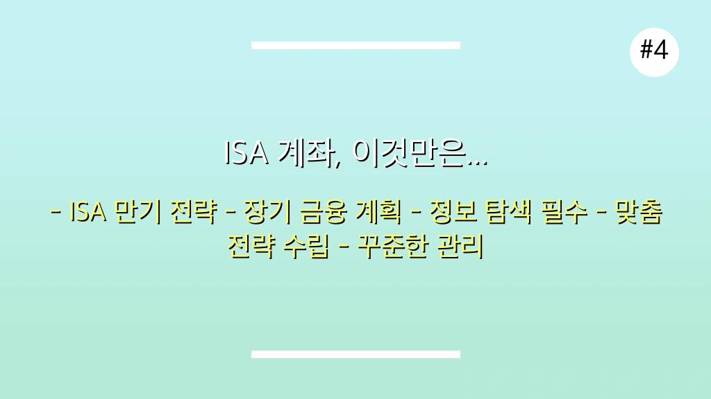 - 지속적인 관리: ISA 계좌뿐만 아니라 모든 금융 상품을 정기적으로 점검하고 관리하는 습관이 중요합니다.