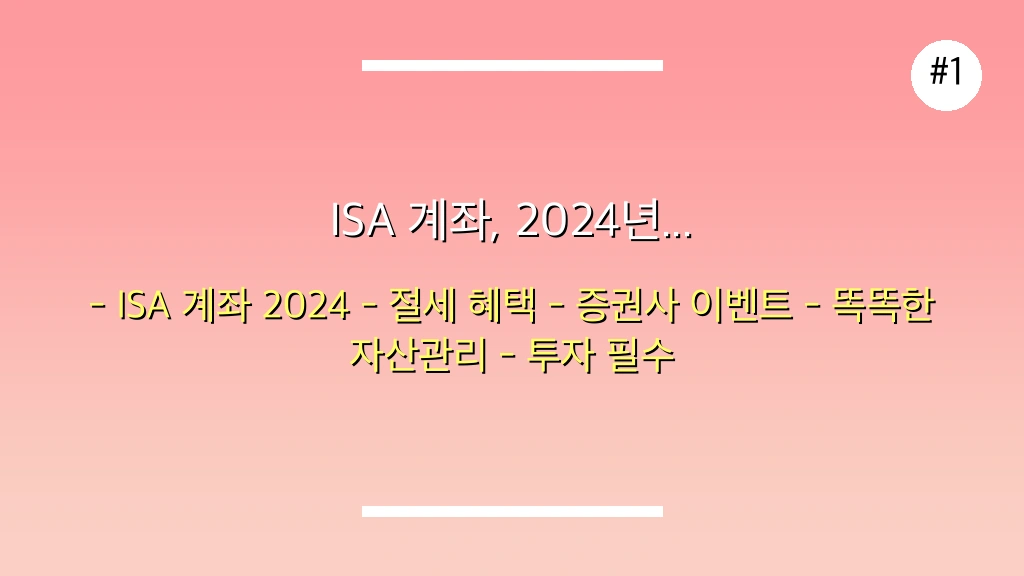 ISA 계좌는 절세와 더불어 다양한 투자 기회를 제공하며, 2024년에는 더욱 풍성해진 이벤트로 여러분의 자산 증식을 돕고 있습니다. **이제 더 이상 망설일 이유가 없습니다.**