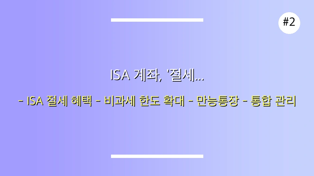 "ISA는 합리적 절세수단이자 장기 투자 플랫폼입니다. 특히 금융투자소득세 도입 이후 투자자 절세 수단으로서 중요성이 더욱 커졌습니다." - 금융 전문가 의견