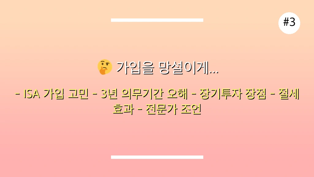 처음 ISA 계좌에 대해 접했을 때, '3년 의무 가입 기간'과 '원금 손실 가능성'이 부담스럽게 느껴질 수 있습니다. 급하게 자금이 필요한 상황이 발생하거나, 투자 상품 선택에 대한 불안감 때문에 가입을 망설이는 분들도 계실 것입니다. 하지만 이러한 우려에 대해 좀 더 깊이 살펴보면, ISA 계좌의 장기적인 이점을 확인할 수 있습니다.