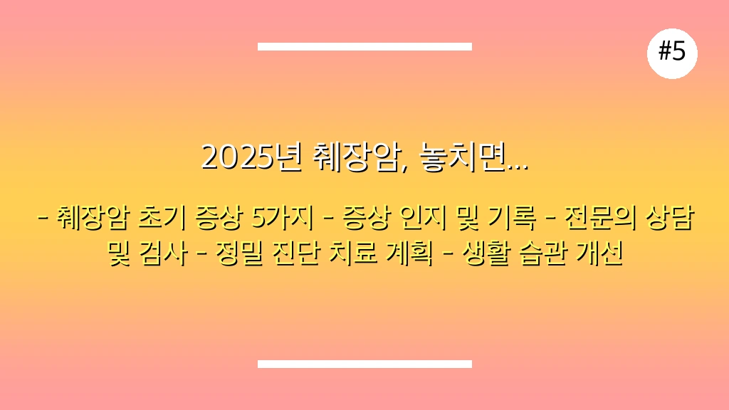 췌장암은 조기에 발견하기 매우 어려운 암으로 알려져 있습니다. 하지만 우리 몸이 보내는 미세한 신호, 즉 췌장암 초기증상 5가지를 정확히 인지하고 있다면 치료 성공 가능성을 크게 높일 수 있습니다. 본 가이드에서는 2025년 최신 정보를 바탕으로 췌장암의 주요 초기 증상, 원인, 그리고 생존율까지 상세하게 총정리하여 여러분의 건강을 지킬 수 있도록 돕겠습니다.