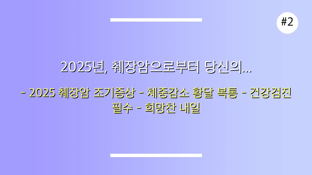 2025년, 췌장암 초기증상 10가지를 미리 알고 대비하는 것은 단순한 건강 관리를 넘어, 당신의 소중한 생명을 지키는 가장 확실한 투자입니다. 복통, 설명 없는 체중 감소, 황달, 새로운 당뇨병 진단 등 의심되는 신호가 있다면 절대 망설이지 마세요. 전문가의 조언을 따르고 정기적인 건강 검진을 통해 췌장암을 조기에 발견하고 효과적으로 치료하여 건강하고 희망찬 미래를 만들어나가시길 바랍니다. 당신의 건강한 오늘이 췌장암 없는 내일을 만듭니다.
