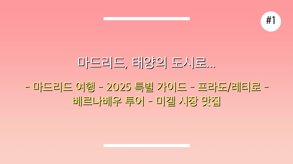 열정, 예술, 미식, 그리고 눈부신 햇살이 어우러진 스페인의 심장, 마드리드로 여러분을 초대합니다. 2025년, 더욱 풍성하고 특별한 마드리드 여행을 위한 완벽한 가이드를 지금 만나보세요. 놓치면 아쉬울 핵심 명소부터 숨겨진 매력까지, 이 가이드 하나로 마드리드 정복 완료!