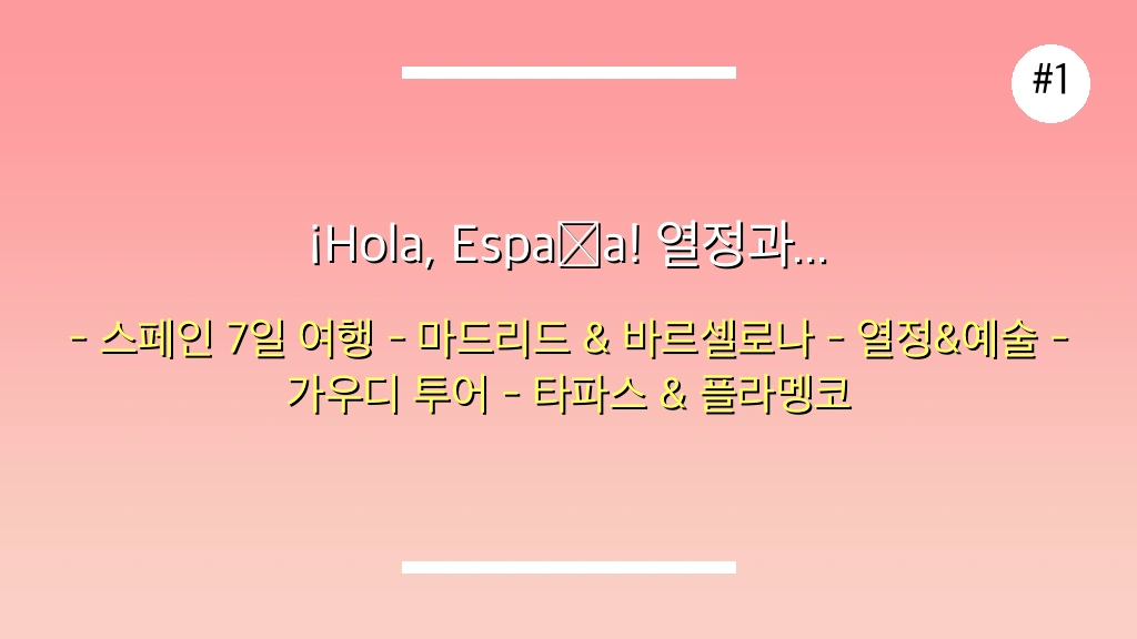 “스페인 여행은 단순히 눈으로 보는 것을 넘어, 삶의 깊은 열정을 느끼는 특별한 경험입니다. 다채로운 타파스와 와인, 그리고 거리 곳곳에서 울려 퍼지는 음악이 당신의 마음을 사로잡을 거예요. 잊지 못할 추억을 만들어 보세요.”