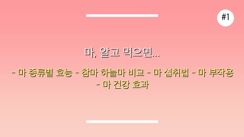 참마는 체력, 면역력, 혈당 조절에, 하늘마는 간 건강과 골격 강화에 더욱 특화된 효능을 가집니다. 마의 부작용 걱정은 옥살산칼슘으로 인한 일시적 가려움증과 드문 알레르기 반응 정도이며, 올바른 손질과 주의만 기울이면 매우 안전하게 섭취할 수 있습니다. 찌거나 익혀 먹는 방법을 추천하며, 여러분의 건강 관리에 마를 똑똑하게 활용하시길 바랍니다!