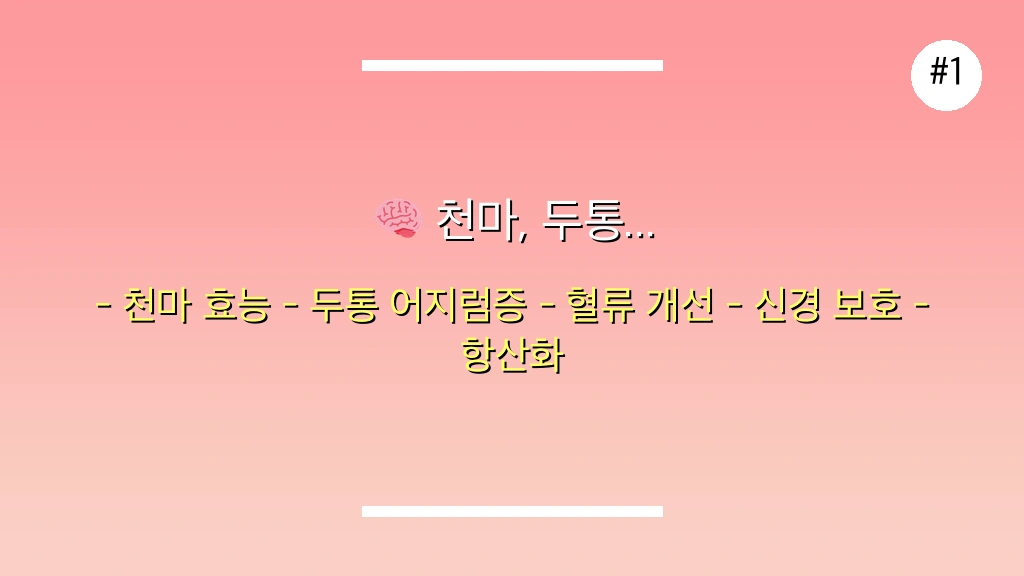 두통과 어지럼증으로 일상이 힘드신가요? 예로부터 귀한 약재로 알려진 천마가 여러분의 고민을 덜어줄 수 있습니다. 특히 천마의 핵심 성분인 게스트로딘(gastrodin)과 에르고티오네인(ergothioneine)은 뇌 건강 증진과 강력한 항산화 작용으로 주목받고 있습니다. 이 글에서는 천마의 놀라운 효능부터, 효과를 극대화하는 섭취법, 그리고 주의사항까지 핵심 정보만 담아 완벽하게 공개합니다.