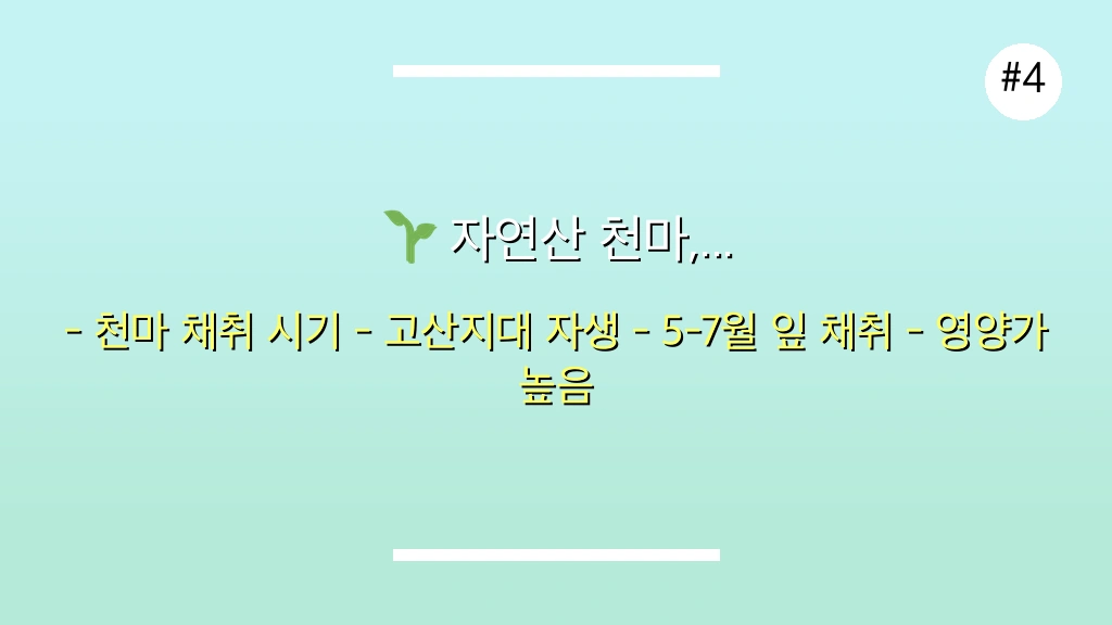 자연산 천마는 5월부터 7월 사이, 싹이 올라오거나 잎이 활발하게 자라는 시기에 채취하는 것이 가장 좋습니다. 특히 잎은 단오 전에, 가지는 여름에 채취하는 것이 영양가가 높다고 알려져 있습니다. 천마는 주로 해발 400m 이상의 고산지대에서 자생하며, 썩은 참나무를 양분으로 삼는 기생 식물입니다. 이 시기를 놓치면 최적의 효능을 얻기 어렵습니다.