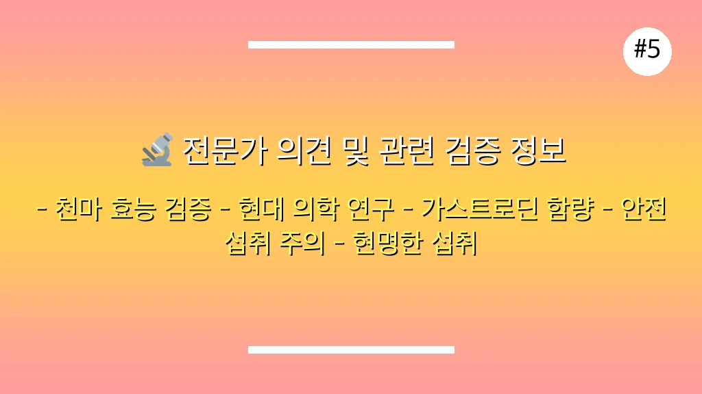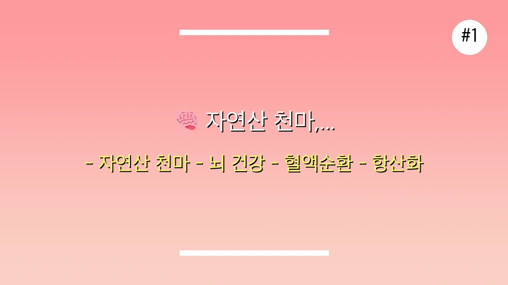 💡 천마의 핵심 유효 성분인 가스트로딘, 에르고티오네인, 바닐릴알코올은 각각 뇌 건강 증진, 항산화 및 노화 방지, 혈액 순환 개선에 획기적인 도움을 줍니다.