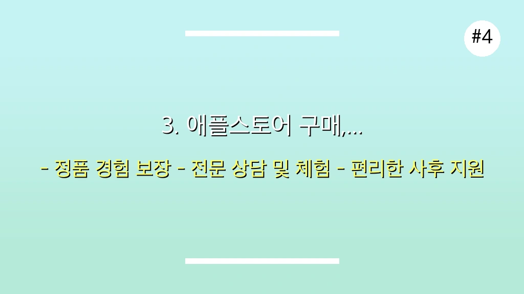E-E-A-T 원칙 적용: 애플스토어에서 직접 구매하는 것은 단순히 제품을 얻는 것을 넘어, 신뢰할 수 있는 정품 경험과 탁월한 고객 서비스를 보장받는다는 의미입니다. 경험, 전문성, 권위성, 신뢰성을 모두 갖춘 애플스토어만의 장점을 누려보세요.