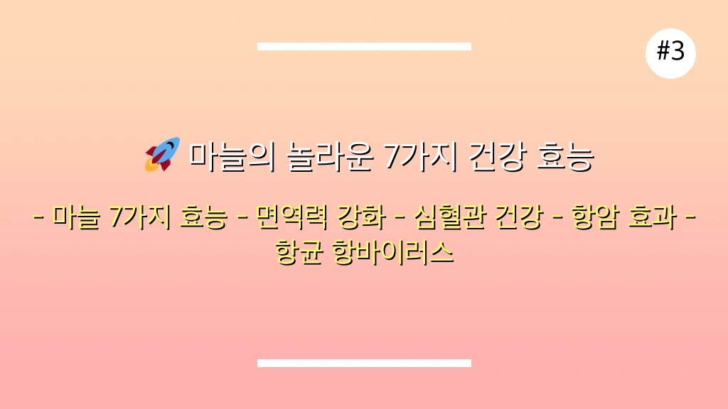 - 3. 항암 효과 기대: 여러 연구에서 마늘이 특정 암세포의 성장을 억제하고 발암 물질의 작용을 막아 암 발생 위험을 낮출 수 있다는 가능성을 보여주고 있습니다.