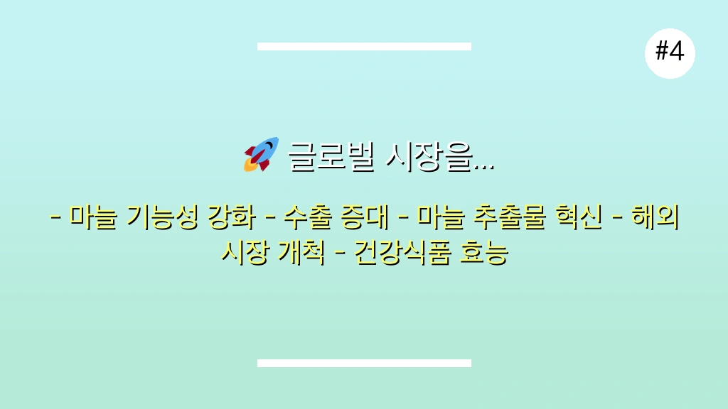 마늘 산업은 단순한 생산 단계를 넘어, 기능성을 강화하고 글로벌 시장으로 뻗어나가며 고부가가치 산업으로 성장하고 있습니다. 연구 개발 투자 확대와 더불어 한국 마늘의 우수성을 알리기 위한 노력이 결실을 맺고 있습니다.