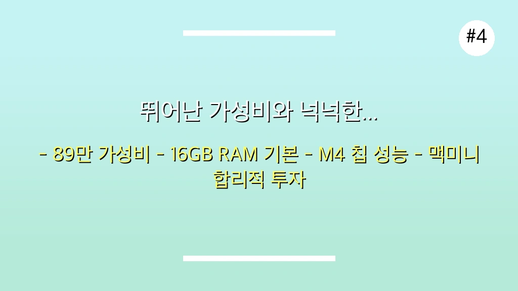 맥미니 M4는 최신 M4 칩 기반의 강력한 성능, 16GB 기본 메모리, 팬리스 무소음 설계, 컴팩트한 디자인, 그리고 뛰어난 가성비까지, 사용자가 맥미니에게 기대하는 모든 요소를 충족시키는 최적의 선택입니다. AI 시대를 맞아 더욱 중요해진 컴퓨팅 파워와 효율성을 합리적인 가격으로 경험하고 싶다면, 지금 바로 맥미니 M4를 선택하시길 바랍니다. 후회하지 않을 최고의 투자가 될 것입니다.