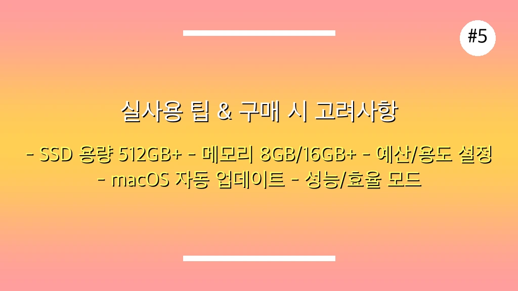- 추천 사양: M4 기본 모델 (8GB RAM, 256GB 또는 512GB SSD)
