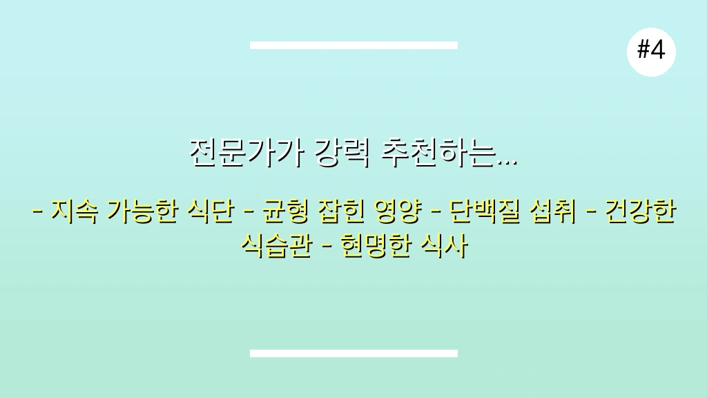 - 균형 잡힌 식품군 섭취: 곡물, 단백질, 건강한 지방, 풍부한 채소와 과일을 포함하여 우리 몸에 필요한 필수 영양소를 충분히 섭취하는 것이 중요합니다.[1][2][4]