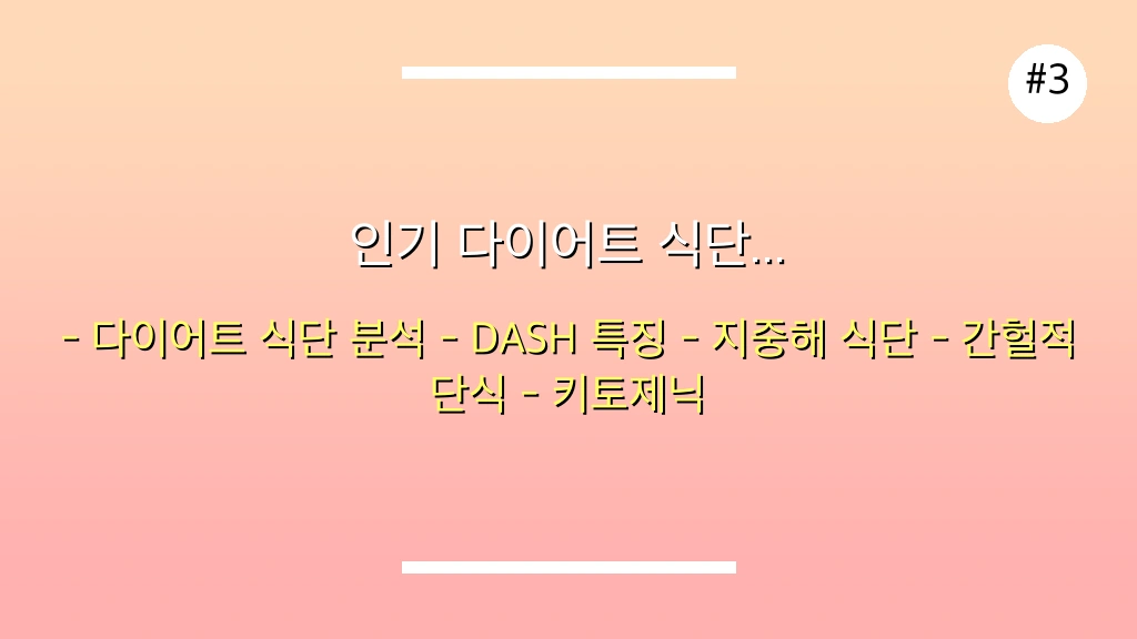 결론적으로, 2025년 최신 다이어트 식단 가이드의 핵심은 개인의 신체 상태와 목표에 최적화된 칼로리 및 매크로 영양소 비율을 과학적으로 관리하고, 대사와 장 건강을 고려한 균형 잡힌 식품군을 섭취하는 것입니다. 대시 다이어트, 지중해 식단, 간헐적 단식, 키토제닉 식단 등 다양한 인기 식단을 전문가들은 추천하지만, 식단 간의 궁합과 나의 생활 방식에 맞는 지속 가능성을 최우선으로 고려해야 합니다.[1][2][3][4][8] 지금 바로 여러분에게 맞는 완벽한 다이어트 식단을 설계하고 건강한 변화를 시작하세요!