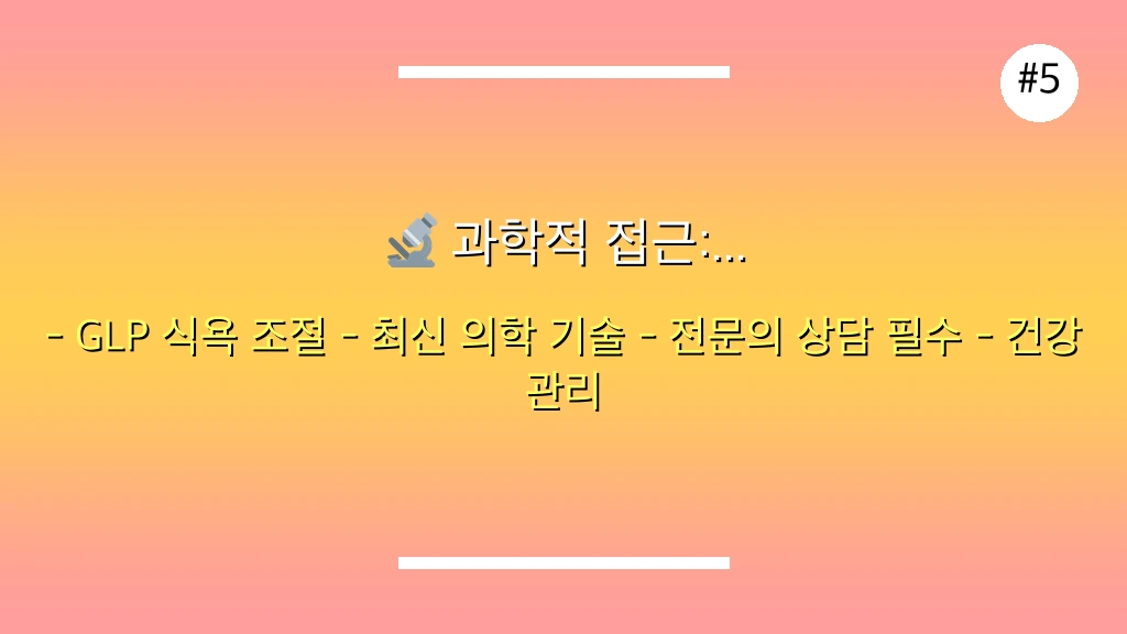 GLP-1 기반 식욕억제제와 같은 혁신적인 의학 기술의 발전은 식욕 조절과 체중 감량에 대한 과학적이고 효과적인 지원을 가능하게 합니다. 하지만 이러한 최신 보조제 활용은 반드시 전문의와의 심층 상담과 체계적인 의료 관리를 통해 이루어져야 합니다. 개인의 건강 상태에 맞는 안전하고 효과적인 접근이 중요합니다.
