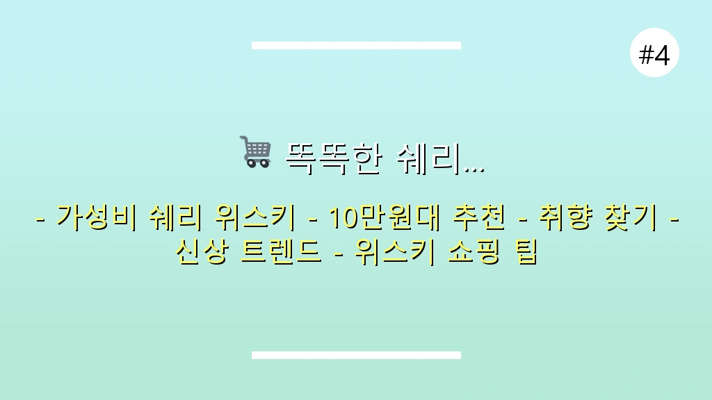 - 가성비 쉐리 위스키 트렌드 파악: 국내에서는 10만원 이하의 쉐리 위스키가 꾸준히 사랑받고 있으며, 새롭고 매력적인 제품들이 계속해서 출시되고 있습니다. 최신 정보를 파악하는 것이 좋습니다.