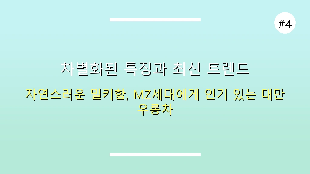 진정한 밀키 우롱차는 '진쉬안(Jin Xuan)' 품종이 가진 자연스러운 크리미함과 부드러움에서 비롯됩니다. 인공적인 향이 아닌, 차 본연의 매력을 즐겨보세요. 한편, 복숭아 우롱차와 같이 과일향이나 인공 가향이 더해진 차들은 전통적인 우롱차와는 구분되는 별개의 카테고리로 이해하는 것이 좋습니다. 최근에는 한국에도 '더정'과 같은 우롱차 전문점이 생기면서 대만 MZ세대들 사이에서 불고 있는 우롱차 열풍이 한국에서도 감지되고 있습니다.
