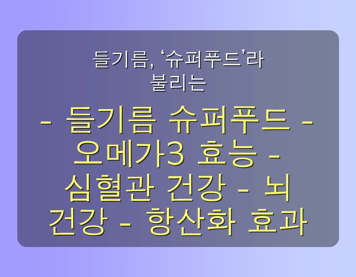 핵심 효능 요약: 들기름의 주요 성분인 오메가-3는 심혈관 건강, 뇌 기능 개선, 강력한 항산화 작용에 탁월한 효과를 보입니다.